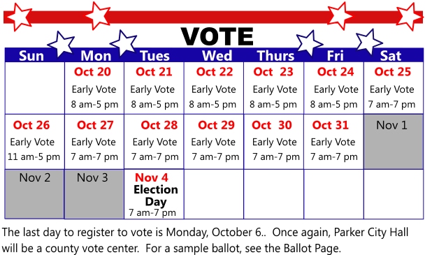 Once again, our City Hall in Parker will be both an early voting location and Election Day location. Or, you may vote at any voting location in Collin County during both early voting and on Election Day.